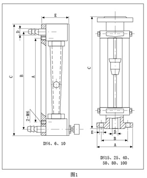 RZ-LZB/LZB-( )F流量計(jì)的錐管為光滑內(nèi)壁管(見圖4),通徑DN15以上的流量計(jì),浮子通過導(dǎo)桿 上下移動,保持穩(wěn)定;RZ-LZJ/LZJ-( )F流量計(jì)錐管 內(nèi)壁有三條導(dǎo)向凸筋,使浮子保持穩(wěn)定(見圖4)。通徑DN10以下的流量計(jì)采用軟管連接,配有 針形流量調(diào)節(jié)閥;通徑DN15以上流量計(jì)采用法蘭連接。