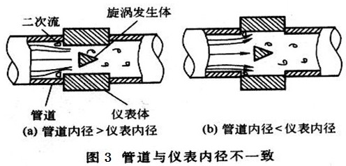 而渦街流量計與安裝管道內徑也會存在誤差,或大或小,如圖3所示,當被測介質經過時,也會發生二次流動,對測量結果產生波動影響。