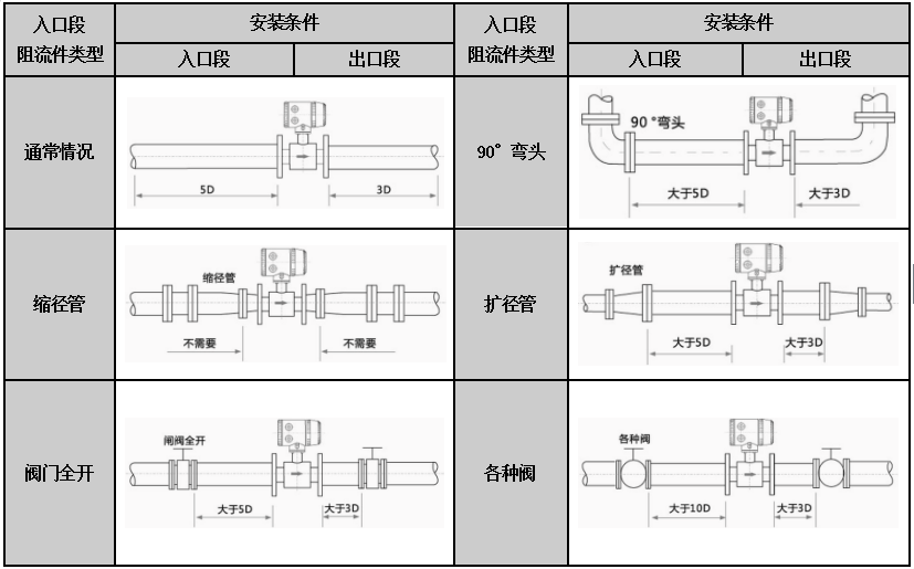 4、流量計的上下游管道應與儀表的口徑相同,連接法蘭或螺紋應與儀表的法蘭和螺紋匹配,儀表上游直管段長度應保證是儀表公稱口徑的10倍,下游直管段長度應保證是儀表公稱口徑的5倍。