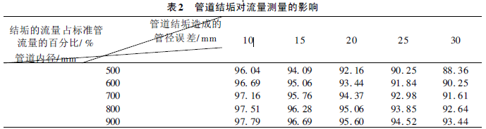 管道結垢,不但造成管徑誤差,還會使聲波發生散射,降低超聲波流量計的測量精度。結垢過厚時,儀表甚至不能工作。表2為管道結垢對流量測量的影響計算表。