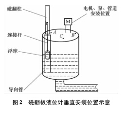 圖 2 中, B 點靠近電機和泵, 磁翻板液位計安裝在此處既影響電機及泵的檢修, 又因泵附近液位的環流波動較大, 對浮子導向管沖刷嚴重, 故 B 點不合理; C 點處因有管道通過, 不便維護且影響管道和泵、 電機等的起吊更換, 故也不能選擇 C 點; A 點遠離泵和電機, 且有足夠的空間安裝翻板, 便于維護,所以 A 點較為合適。