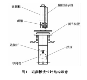 磁翻板液位計是根據磁性原理、 阿基米德浮力定律等巧妙地結合機械傳動的特性而開發研制的一種專門用于液位測量的裝置。典型的磁翻板液位計結構如圖 1 所示。