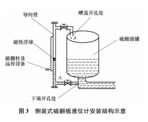 側面安裝方式的關鍵點在于: ①酸槽內壁襯有瓷磚, 故引流管上開孔應選擇槽蓋合適位置, 下孔好在進口管上, 且均需加閥門, 便于維護; ②考慮管內硫酸在極端天氣時對磁翻柱及測量裝置的影響,因本公司循環槽溫度在75 ℃左右, 為避免夏天溫度過高影響傳感器測量, 冬天防凍, 管徑 D 應在 80mm 以上可保證正常測量。