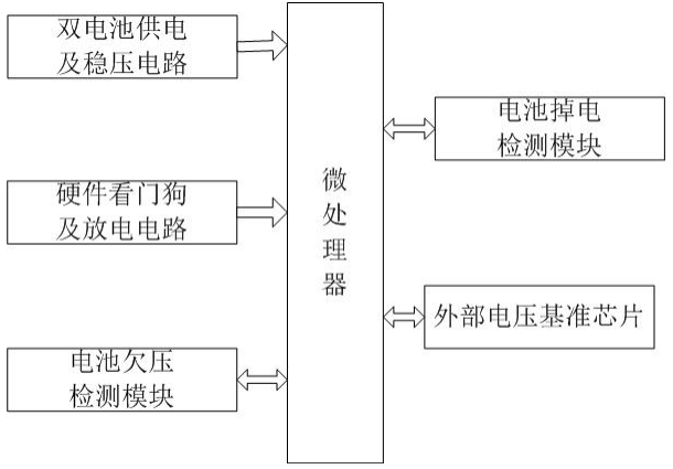 簡介:本實用新型公開了一種用于超聲波水表的電源及容量檢測模塊,包括微處理器、雙電池供電及穩壓電路、硬件看門狗及放電電路、電池欠壓檢測電路、 電池掉電檢測電路、外部電壓基準芯片;雙電池供電及穩壓電路與微處理器的電源端口連接,為其供電;硬件看門狗及放電電路的一端與雙電池供電及穩壓電路連 接,其另一端與微處理器的復位端口連接;電池欠壓檢測模塊與微處理器連接;電池掉電檢測模塊與微處理器連接;外部電壓基準芯片與微處理器電壓參考端口連 接。本實用新型采用雙電池供電方式來增大電池容量,并通過單通道線性穩壓器輸出穩定的3V工作電壓。本實用新型即能保證計量誤差的精確性、又能滿足電池長 期驅動以及系統長期穩定運行。